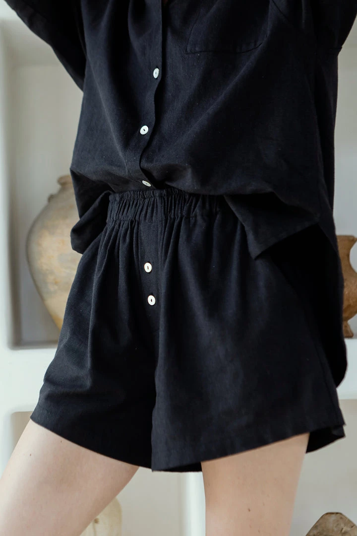 There’s never a better time for a short set in premium linen than this time of the year. When it comes to relaxing, our Winter Night Short House Set comes to the rescue. This 2-piece set has a very modern oversized guise that will make staying at home look and feel indulgent. The button-down shirt has drop shoulders, billowy 3/4 sleeves, and a chic hi-low hemline. The matching shorts come with an elasticated waist and a length that’s just perfect – not too long, not too short. Comes in classic shell and black colors.