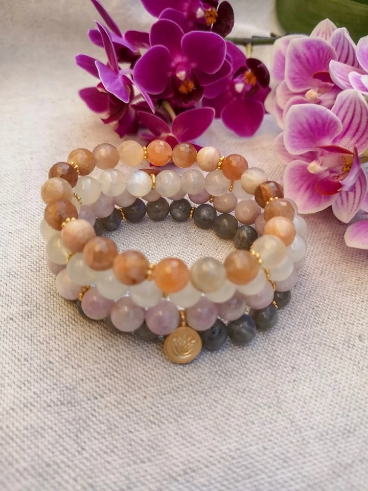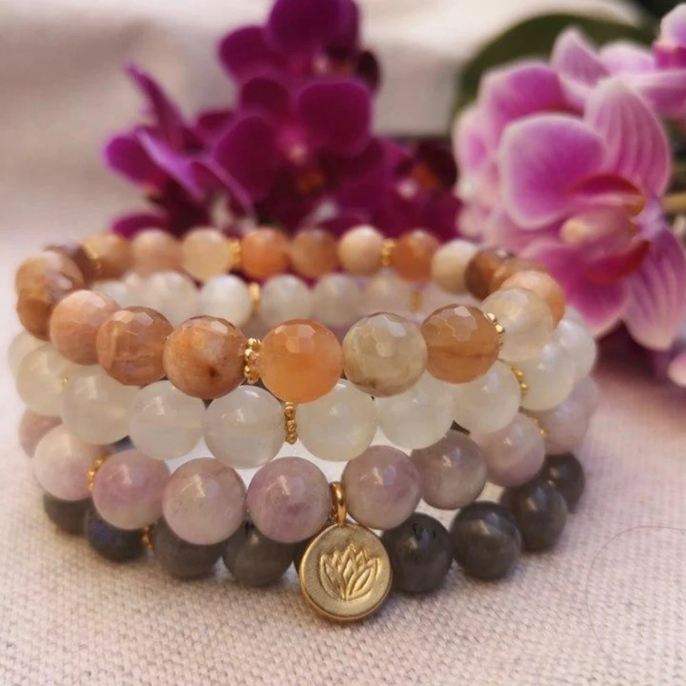 This beautiful mala bracelet quartet adjusts and tunes your souls unique symphonic frequency, allowing your essence to be amplified. Sunstone, labradorite, moonstone and pink kunzite are powerful gemstones that when combined, work with all your chakras, by unblocking the emotions that no longer serve you, allowing energy to flow effortlessly. Feel yourself crack open to amplify and expand in all areas of your life.