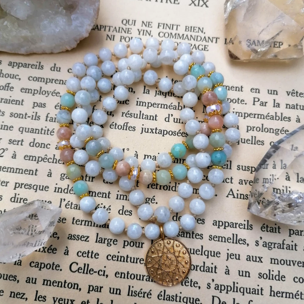 Moonstone is the gemstone of the Goddess, in her fullness of her triple archetypes of maiden, mother and crone. This mala puts us in alignment with our cycles and creativity. Most of us women have repressed our divine feminine energy to adjust to our over-analytical culture that sub estimates intuition, self-care and nature. When a woman embodies her true nature as a Goddess, she shines. She becomes a powerful force of nature that nurtures all areas of her life. She stops people pleasing to become her authentic, self-pleasing self. She expresses her soul by singing, dancing, storytelling, painting and creating. Her life becomes a masterpiece.