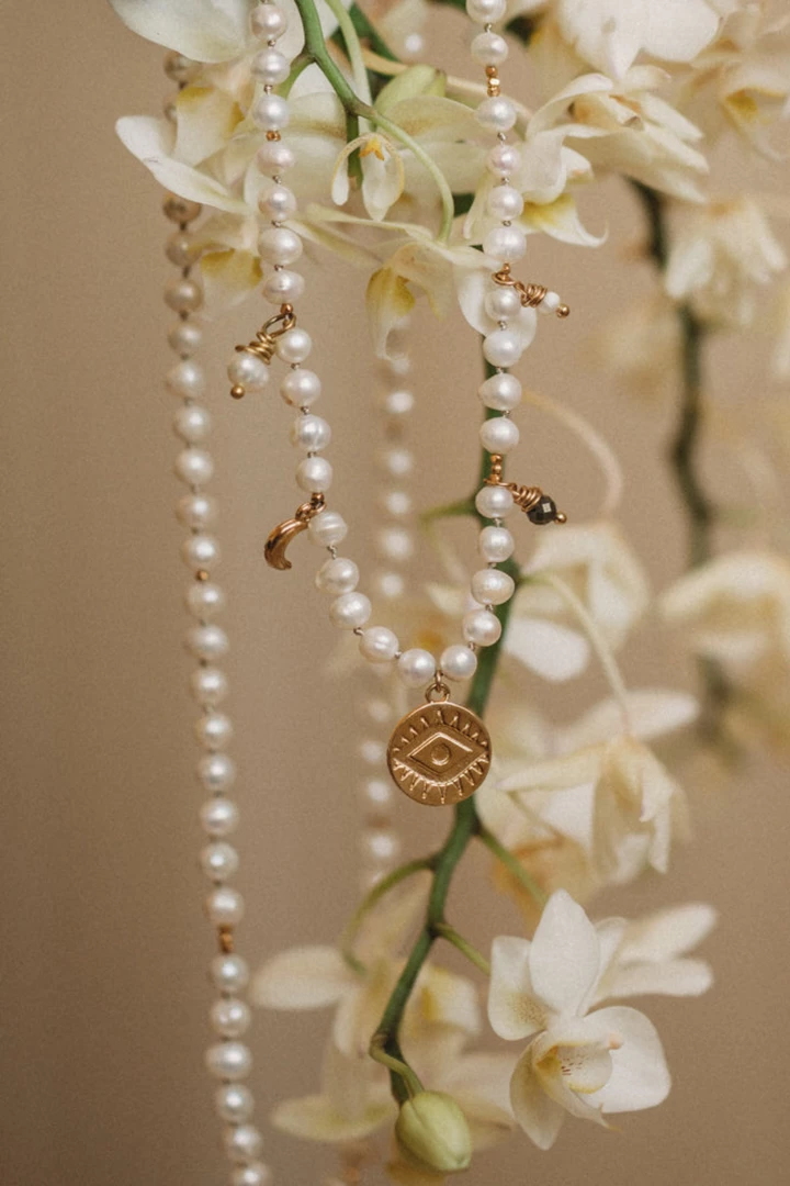 This 18K gold eye represents consciousness, divinity and protection. The 18K gold moon symbolises the Goddess and her connection to the cycles of the moon.