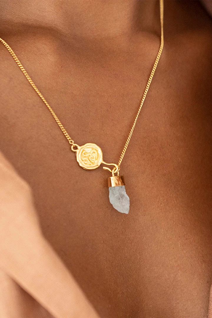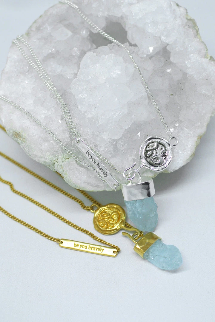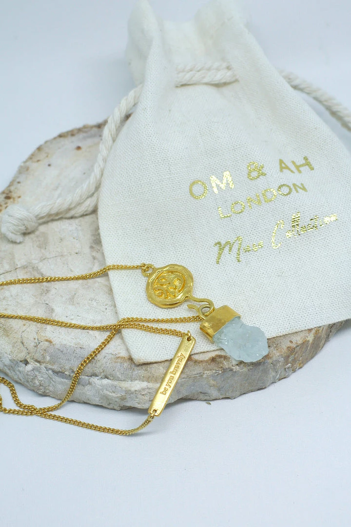 Be You bravely is a stunning necklace with Aquamarine as the central piece, a stone that is known for courage. Its calming energies reduce stress and quiet the mind. Aquamarine has an affinity with sensitive people and allows us to step away from any fear, it keeps us feeling confident and open. The Hidden message sits beautifully at the back of the neck and our Om & Ah symbol placed neatly above this enchanting stone. Choose between Silver or Gold or maybe both? either way enjoy it!