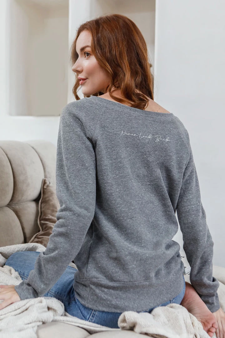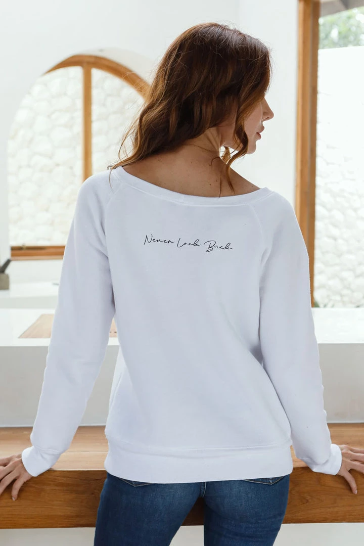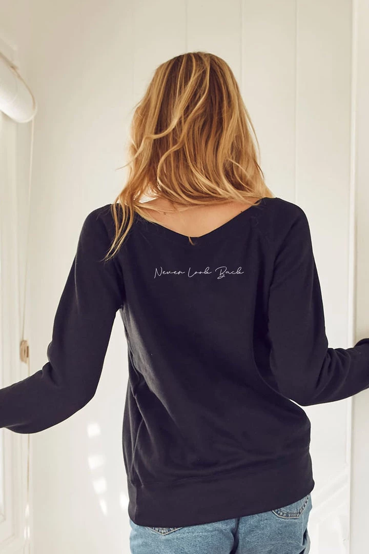 Make comfort a key priority this season with our “Never Look Back” Cozy Pullover. One can never go wrong with its chic boat neckline, long cuffed sleeves, relaxed overall shape, and luxuriously soft fabric. An inspirational quote “Never Look Back” is printed at the back to remind us to be present as there really is no better place to be than now.