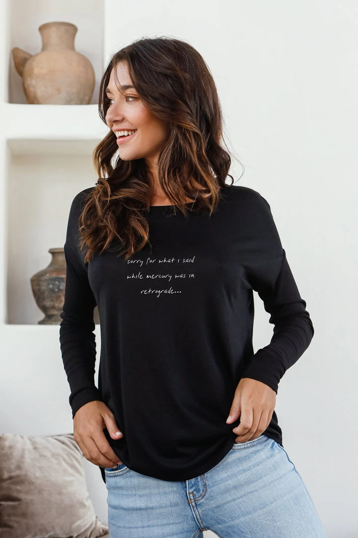 The cheeky quote, “Sorry for what I said while mercury was in retrograde…”, is printed at the front of the shirt, making it a perfect gift for a friend or for yourself! We love cozying up at home in this tee with our relaxed bottoms.