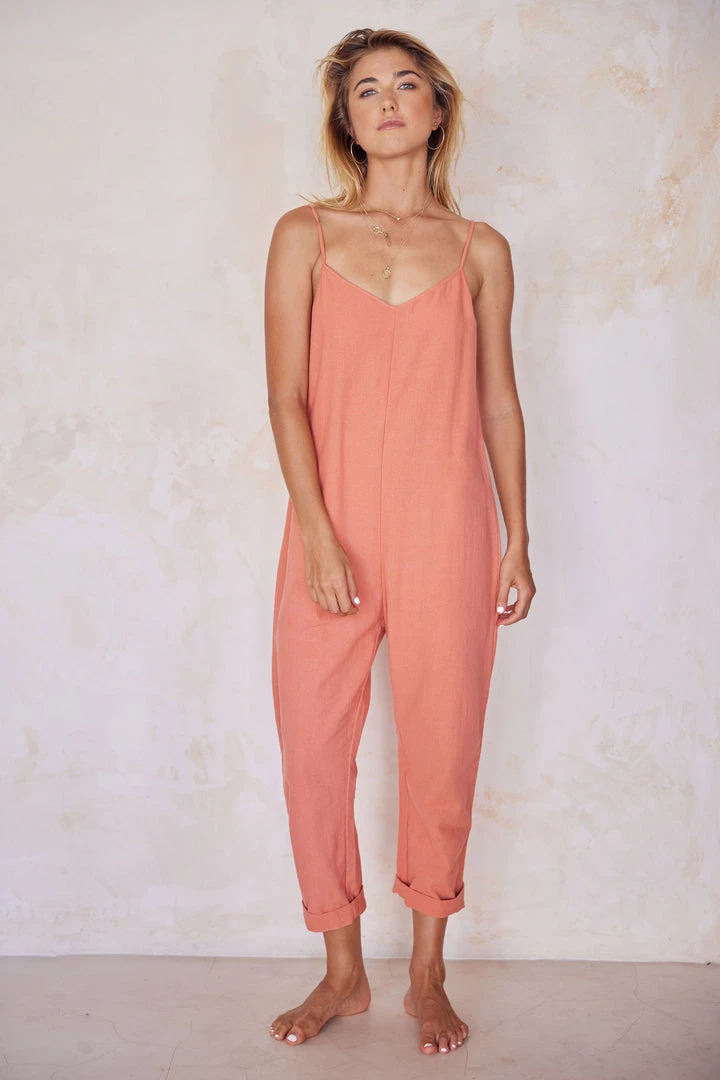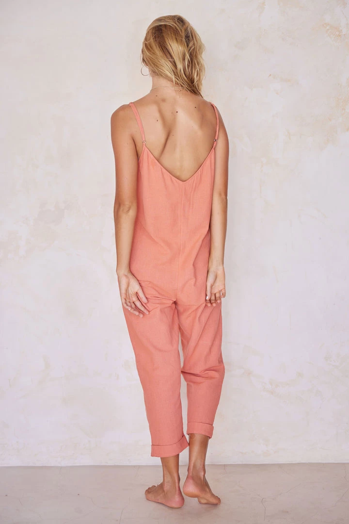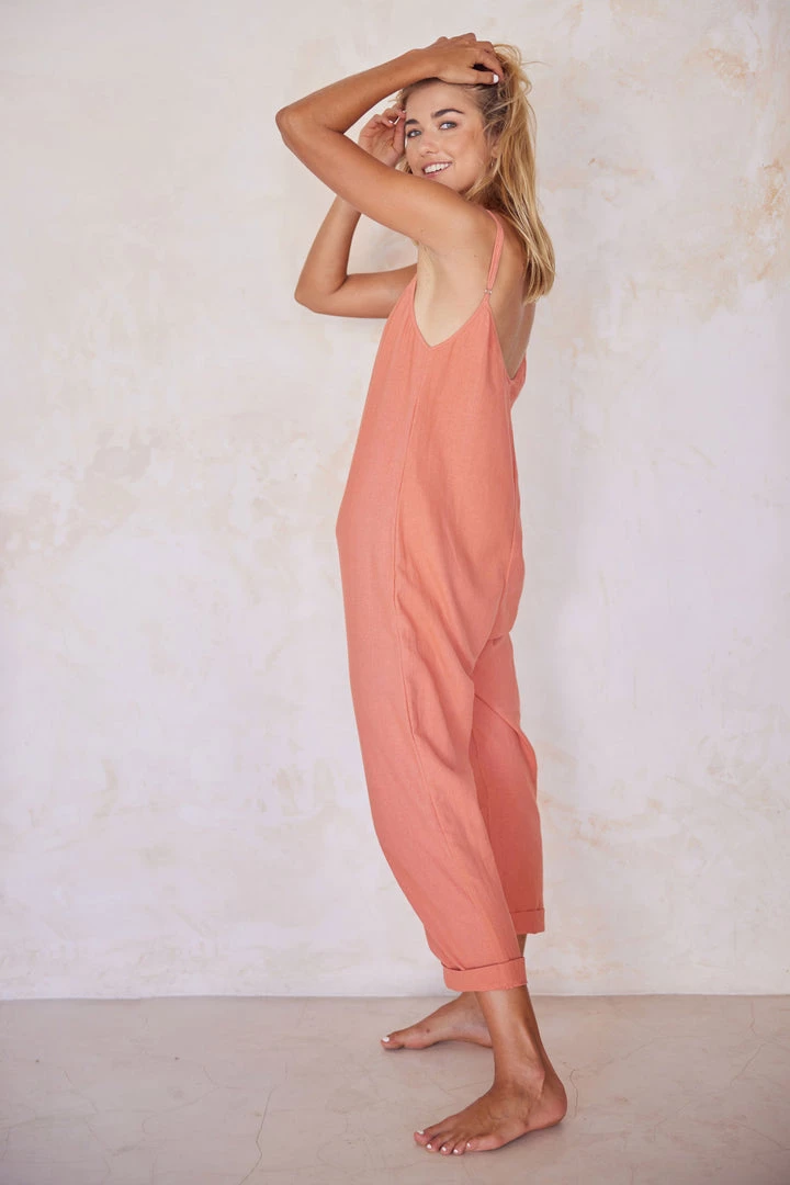 This linen jumpsuit is comfortable and refined, featuring a subtle sloping v-neck in front and a relaxed lower back.